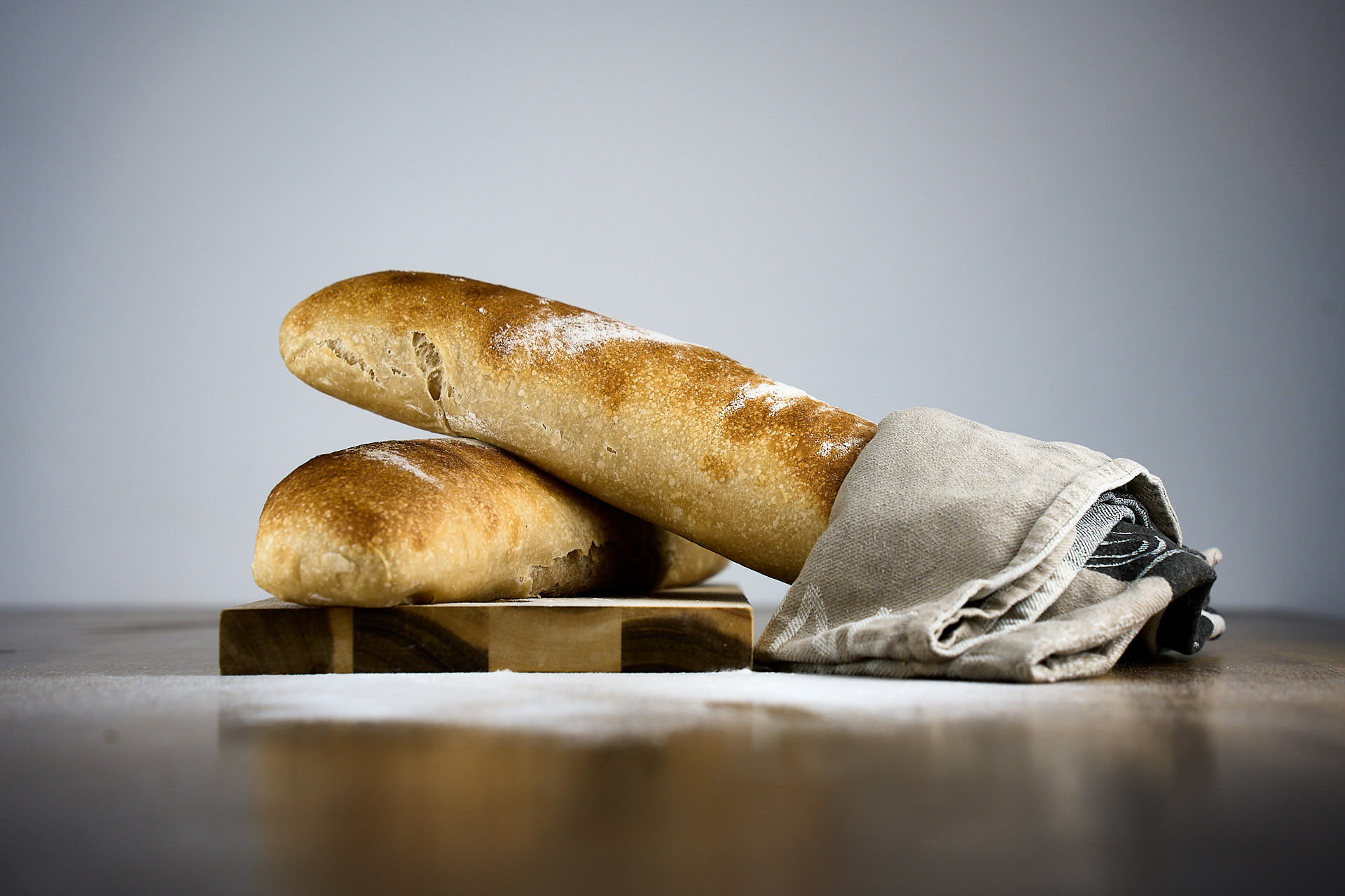 Den Backofen auf 250°C vorheizen, das Backblech einschieben und beschwaden (oder alternativ heißes Wasser auf den Boden gießen). Die Brote sind fertig, wenn sie sich beim Klopfen auf den Boden hohl anhören (nach ca. 20-25 Minuten).